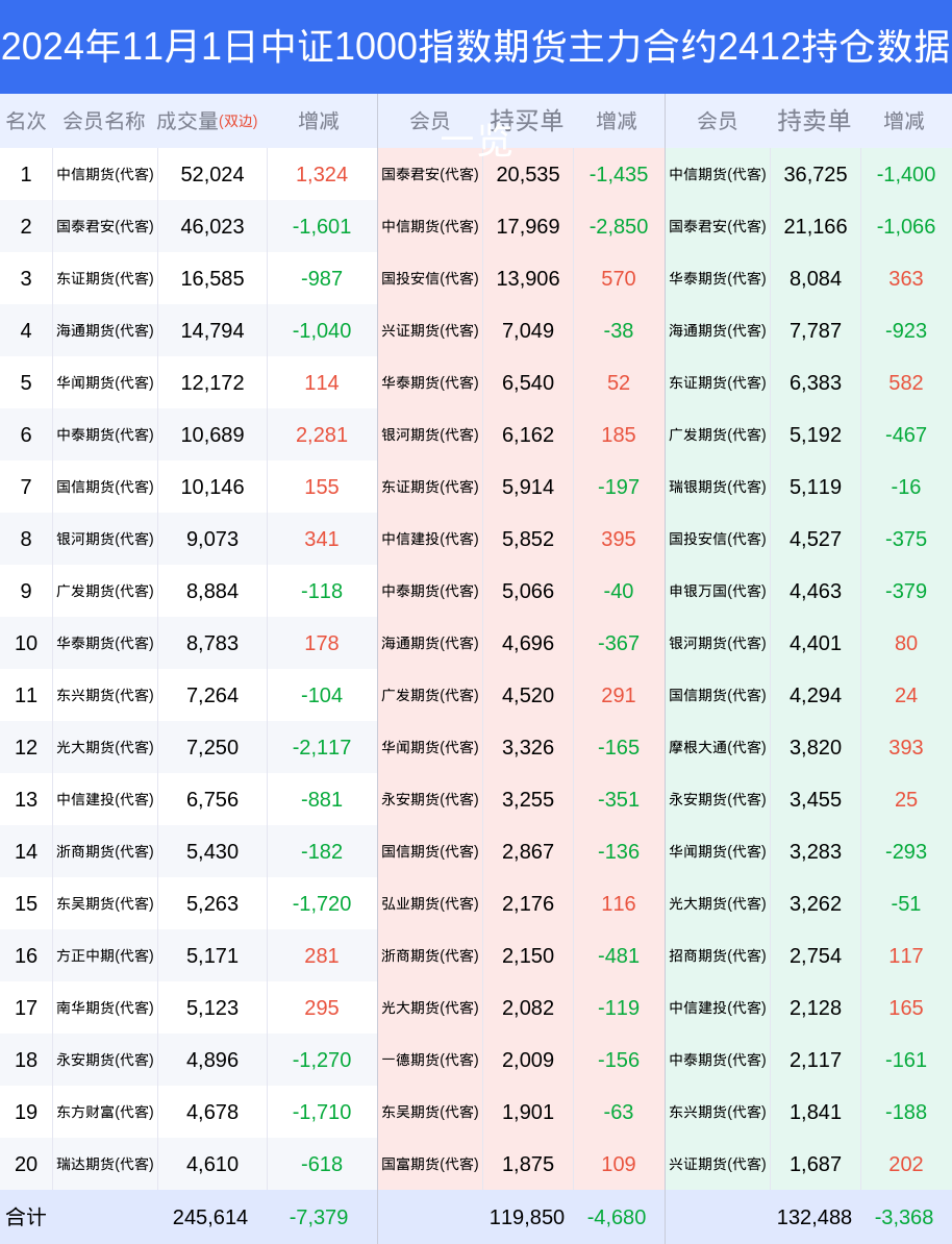 新浪期货 根据交易所数据,截至11月01日收盘主力合约中证1000指数期货2412,涨跌-3.21%,成交量18.61万手,持仓数据显示前20席位呈现净空,差额头寸为12638手。
