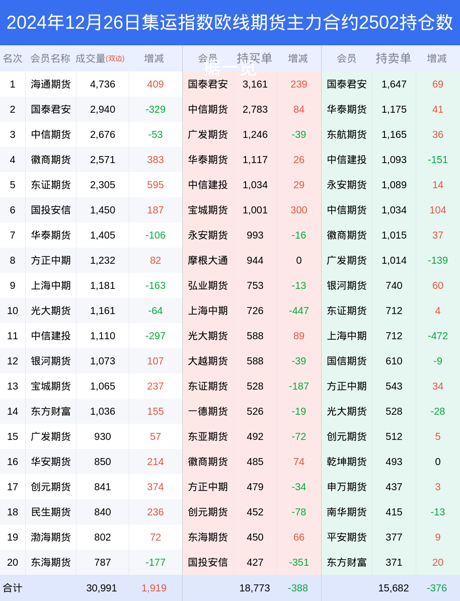 新浪期货 根据交易所数据,截至12月26日收盘主力合约集运指数欧线期货2502,涨跌-2.43%,成交量2.67万手,持仓数据显示前20席位呈现净多,差额头寸为3091手。