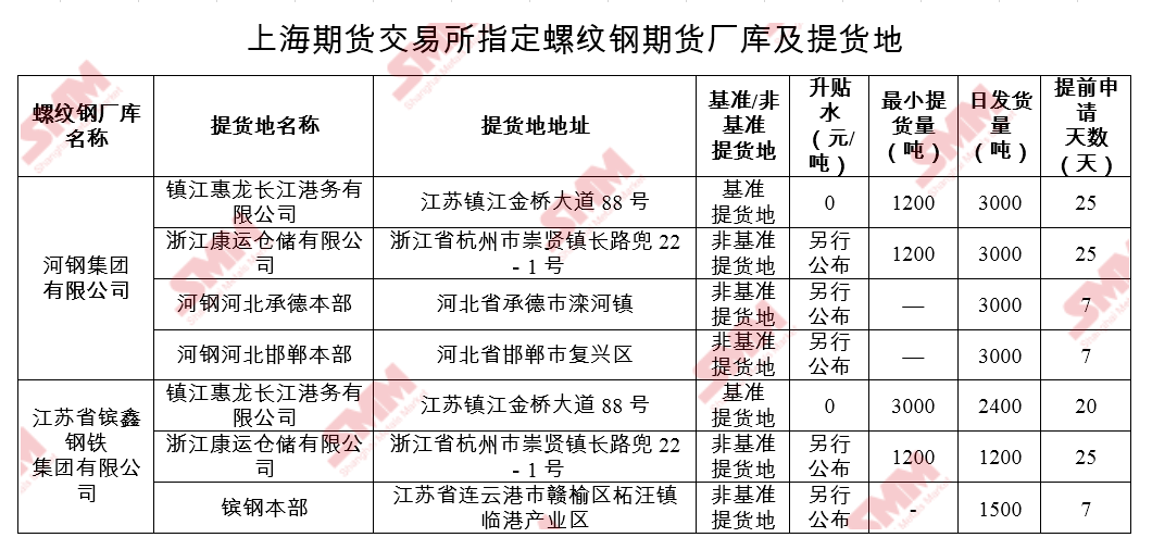 自本公告发布之日起,上述公司成为上期所指定螺纹钢期货厂库,并可自2021年9月23日起开展螺纹钢期货厂库标准仓单生成业务。