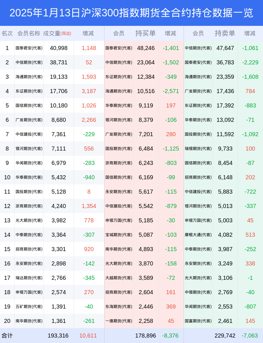 新浪期货 根据交易所数据,截至1月13日收盘主力合约沪深300指数期货2503,涨跌-0.41%,成交量5.63万手,持仓数据显示前20席位呈现净空,差额头寸为27630手。