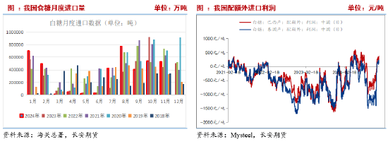 海关数据显示,2024年11月我国进口食糖53万吨,同比增加9.23万吨,本榨季截11月底,我国累计进口106.69万吨, 同比减少29.57万吨。 自今年开始实行的关税调整方案,1702项下的糖浆及预拌粉关税不变,因此对国内进口糖浆及预拌粉的影响相对有限。与此同时,近期原糖价格持续偏弱引导国内进口成本降低,截至1月10日原糖3月合约结算价19.22美分,折算进口成本(不含损耗)约在6360,国内加工糖福建糖业价格维持在6630附近,星光糖业报价约在6850,目前进口利润转正,预计进口量或有增加。尤其原糖远月5月、7月合约结算价分别为18.07、17.70,折算成进口成本(不含损耗)约在6095、5990,进口成本进一步降低,预期远月进口量或有增加。在此背景下,叠加我国产量增加不及预期,或使得整体的进口量或高于此前预期。