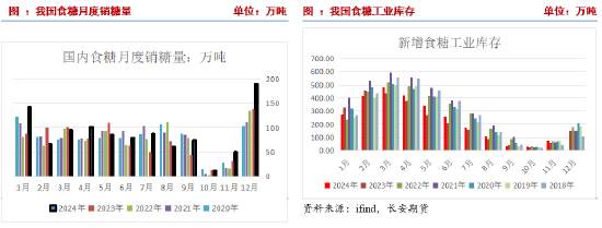 据中国糖业协会数据,本制糖年截至2024年12月底,全国共产糖约440万吨,同比增加约37.8%;累计销糖250万吨,同比增加约47.2%;累计销糖率达到56.8%,同比加快3.6个百分点。其中,12月单月产糖约304万吨,同比增加70万吨,单月销糖189万吨,同比增加51万吨,月产量、销量均创历年同期最高记录。产销双增的数据表现与季节性供应与旺季消费息息相关。但同时,也可以看到工业库存逐步积累至190万吨,同比增加41万吨,处历史同期次高水平,环比增加115万吨。整体来看食糖的累库速度偏快,而随着年前备货逐步结束以及压榨顺利进行,库存仍会继续增加。